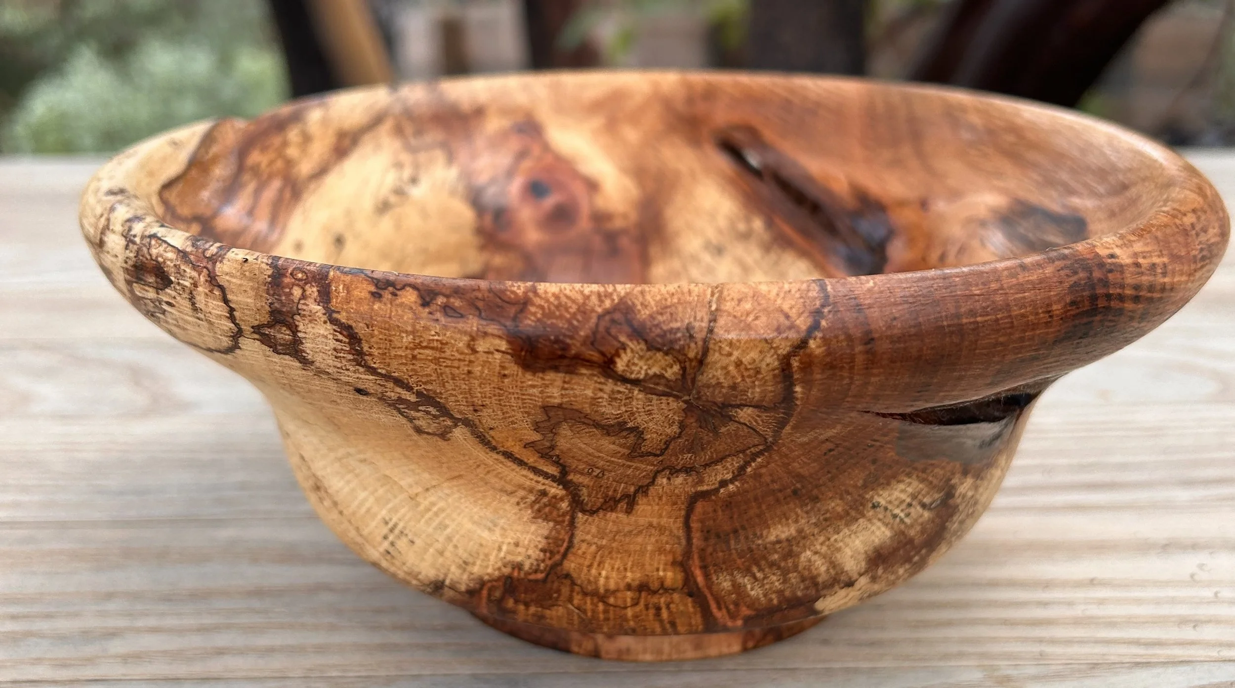 I carved this bowl from a diseased Tan Oak fallen during a fuels reduction and forest revitalization project. The tree was infected with Pytopthera ramorum (Sudden Oak Death) and prior to carving had also sprouted Oyster Mushrooms. Like Douglas Fir, Tan Oaks can be a weedy species that are very flamable and were crowding another Black Oak grove of much older established trees.