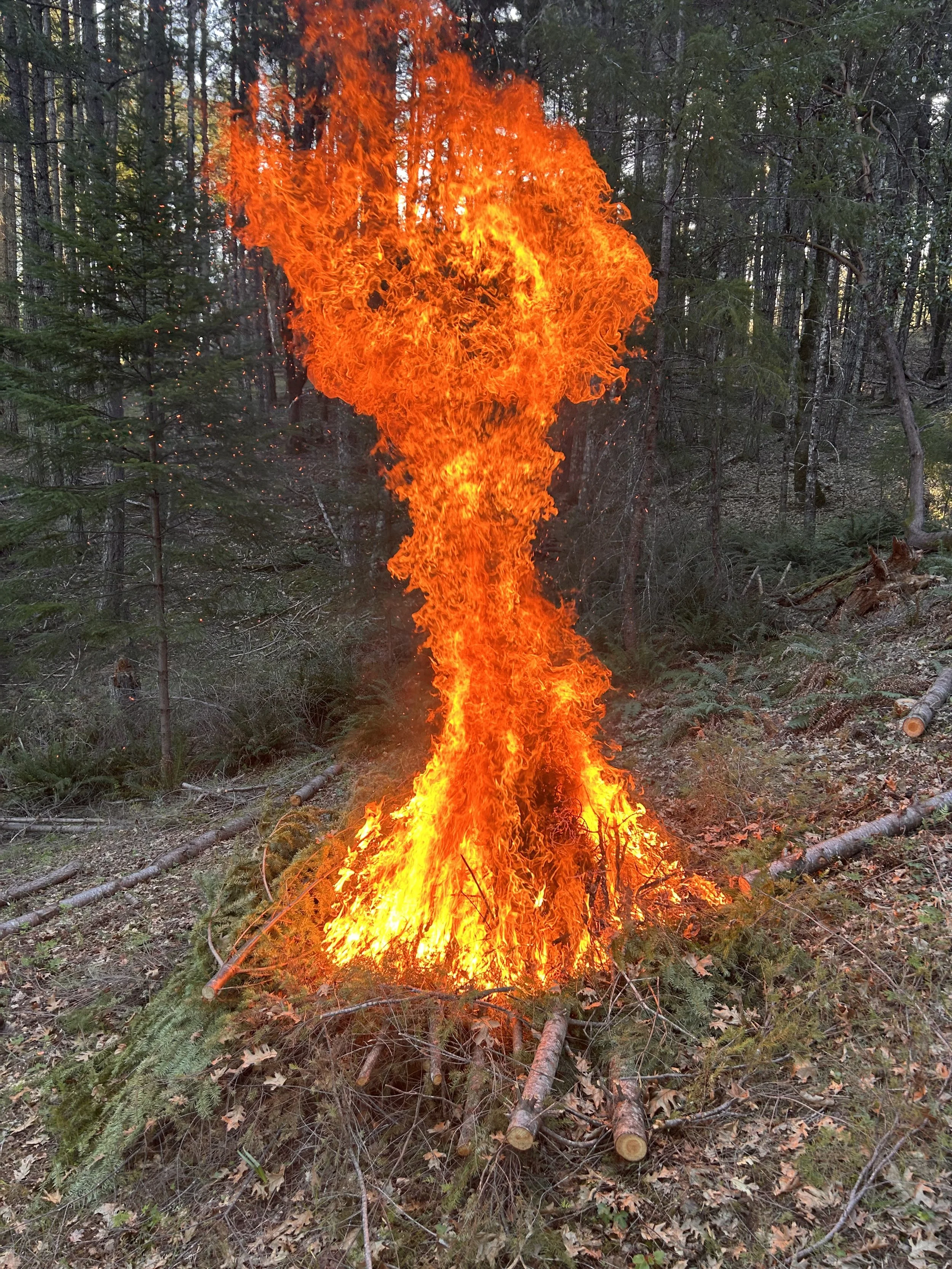A mentor of mine during my college years, Brock Doleman of the Occidental Arts and Ecology Center once put it this way- if you have an acre of trees with 1000 mostly young saplings on it, it is a massive fire danger and unlikely to produce trees of ecological or social value than if that acre has 100 trees on it of mixed age, species composition, and density. When European settlers first arrived in these lands, they often described it as “park-like” and an abundant landscape supporting myriad species in the millions was evident. They mistakenly assumed this was “natural”- as if humans had no hand in it. But we now know that Indigenous peoples, from the Amazonian Basin to the temperate rainforests of the Pacific Northwest had intensive and intentional management strategies based on generations of careful observation that helped to foster these rich landscapes. They did it not through domination and control, but by promoting certain natural cycles and processes that further enhanced the thriving ecologies that they in turn benefited from. And sometimes that meant clearing, cutting, or burning some trees and other plants.