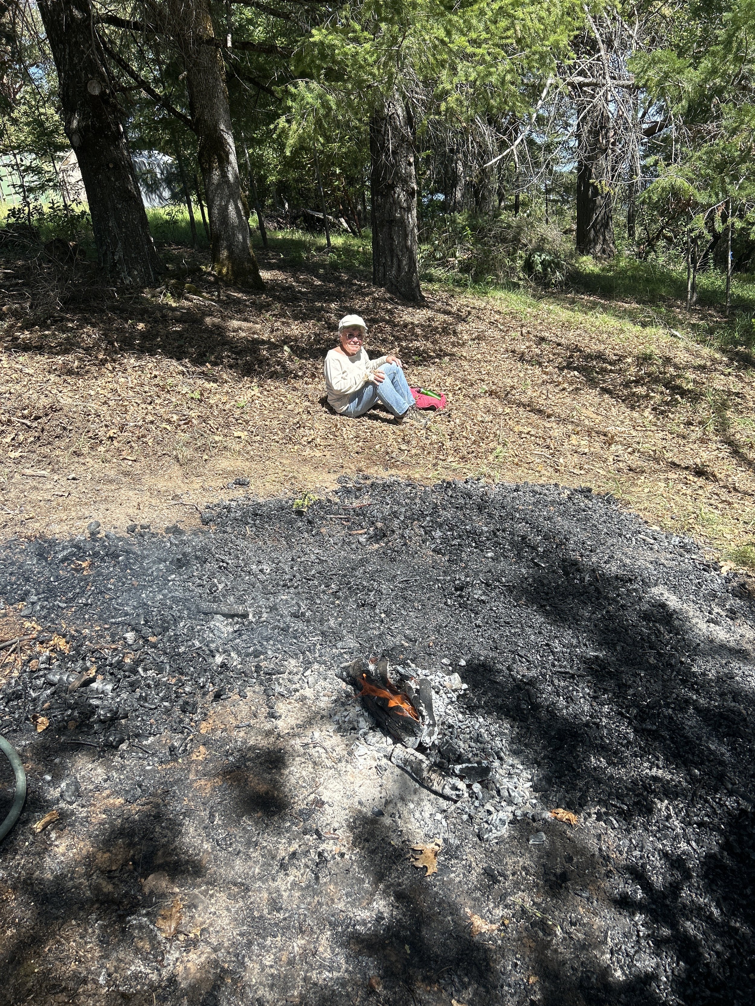 Remains of slash burned for removal (above picture), and intentionally spread out and extinguished early to create useful biochar. Most people who burn piles usually let them burn down to ash, which can also be useful, but I prefer to promote the practice of making biochar which supports a more vital Soil Food Web, and is a form of carbon sequestration. The charred remains are stabilized forms of carbon that don’t decay. Here pictured with a neighbor who helped me with the burn pile while meditating with the fire.
