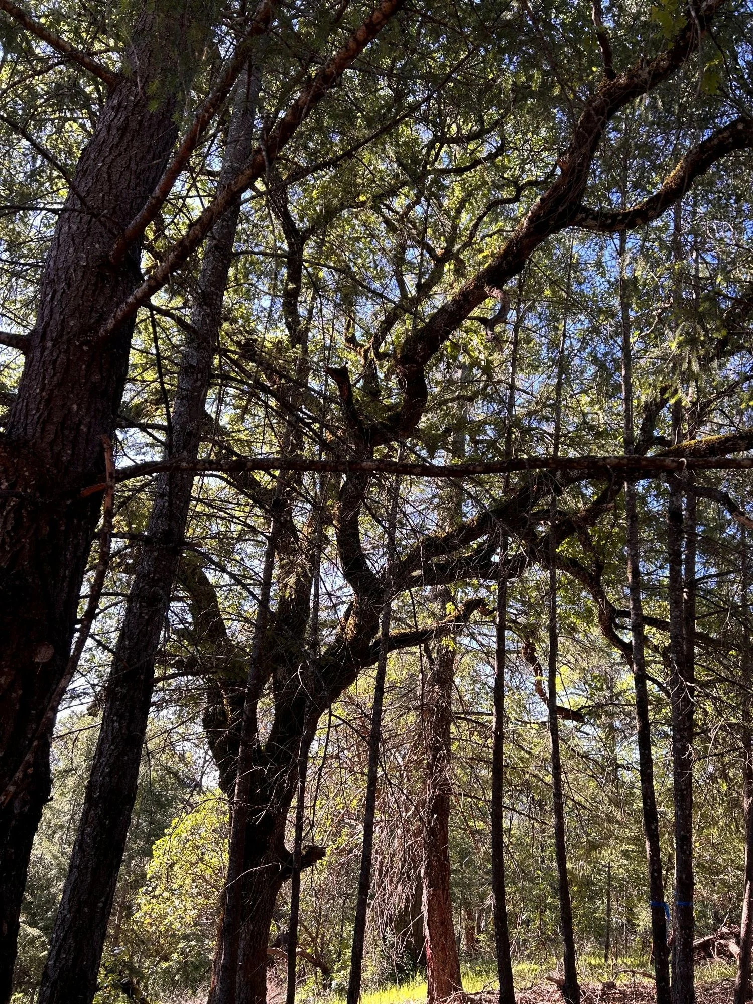 A mature Black Oak (squiggly tree) being outshaded by much younger Doug Firs (straight trees) piercing its canopy. This is after much thinning of smaller trees has already occurred. The younger trees in this photo will also eventually be removed for building materials. This is a result of no-management style of management and a timber-driven, fire-suppression forestry culture.